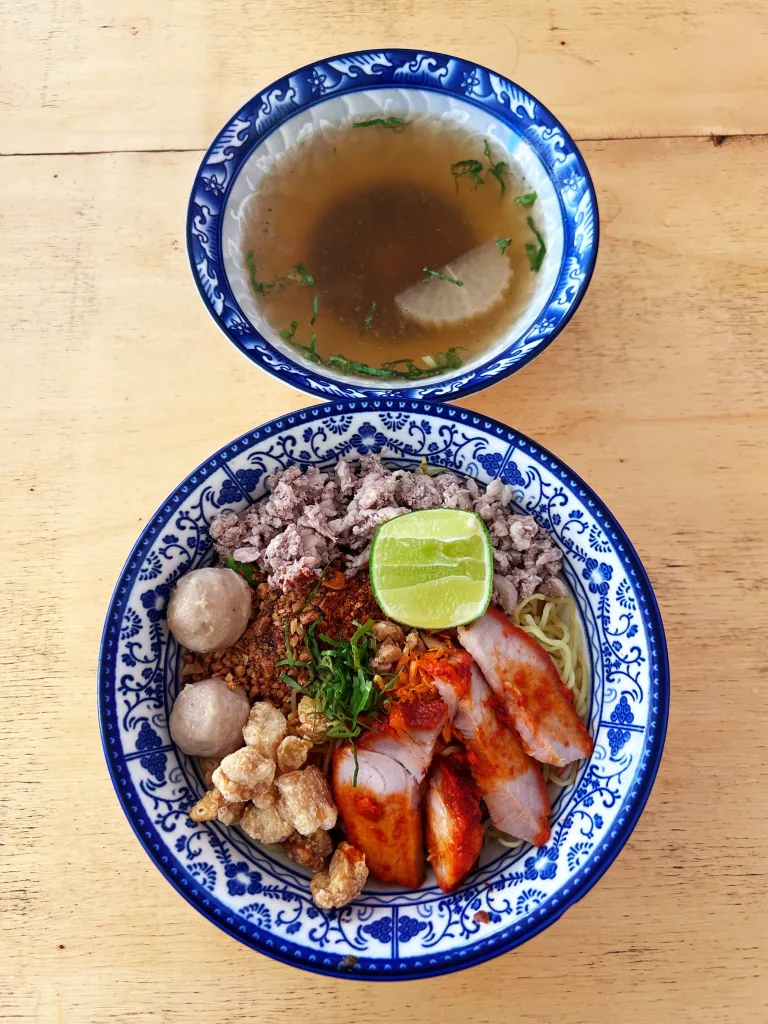 ร้านนี้ไม่ธรรมดา เพราะใช้ สูตรโบราณแท้จากสุโขทัย เส้นบะหมี่เหนียวนุ่ม คลุกด้วยพริกป่น น้ำปลา น้ำตาลปี๊บ มะนาวสดแท้ บวกกับหมูแดงฉ่ำๆ และพระเอกของร้าน “กากหมูทอดกรอบ” ที่ใส่มาแบบไม่หวงของ